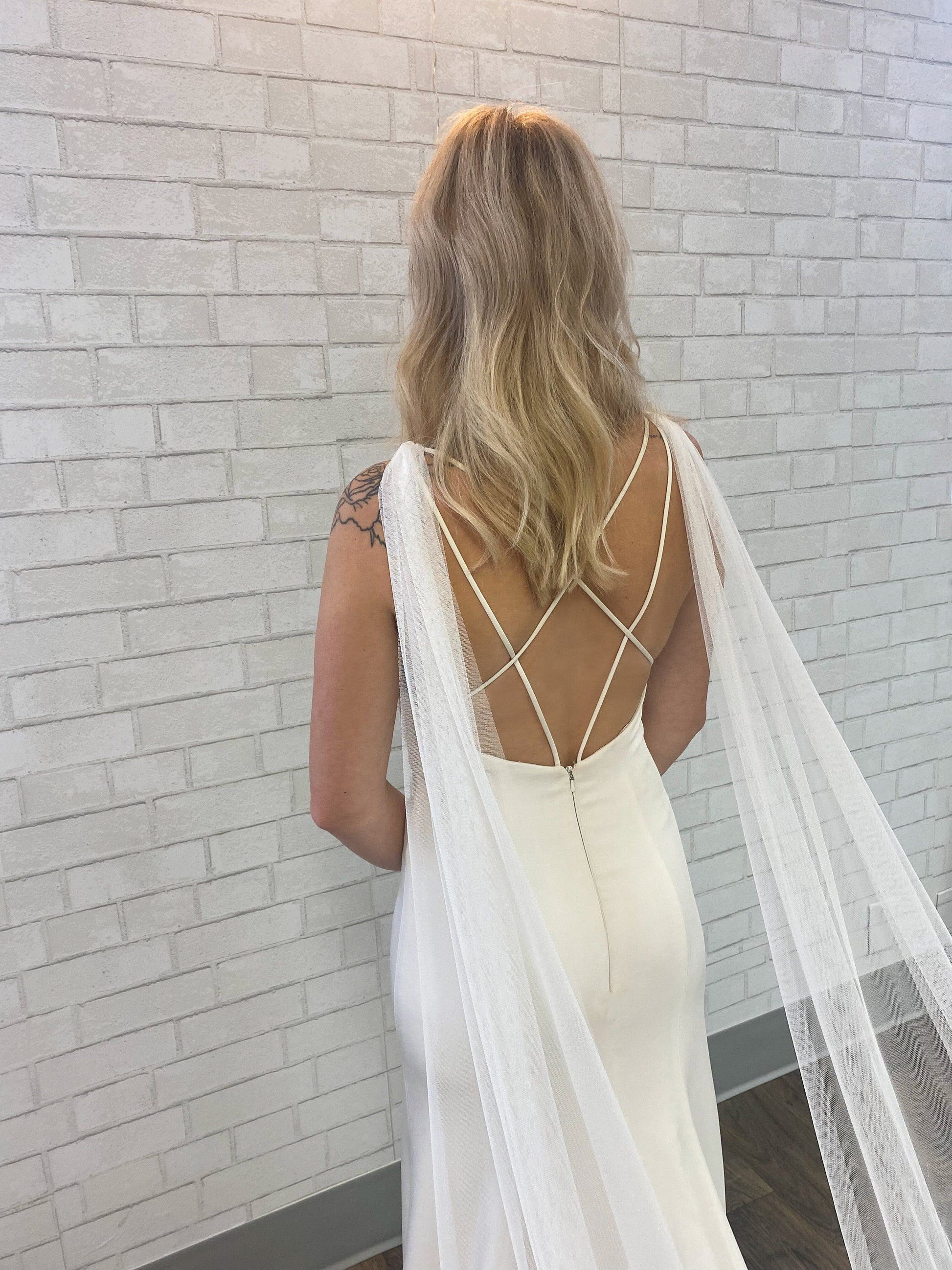 Beautiful and soft bridal wings. Made of luxurious english net fabric to create an effortless drape. Attached at the shoulders with either small white ribbons (for dresses with spaghetti straps) or small 1 inch clasps (for dresses with thicker straps). Attaches at the shoulders and remains unconnected all the way down. Two separate pieces with each piece getting gradually larger at the bottom and each one rounded off at the bottom.