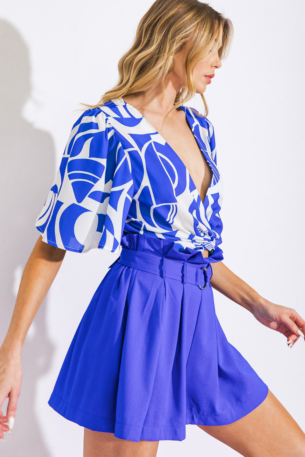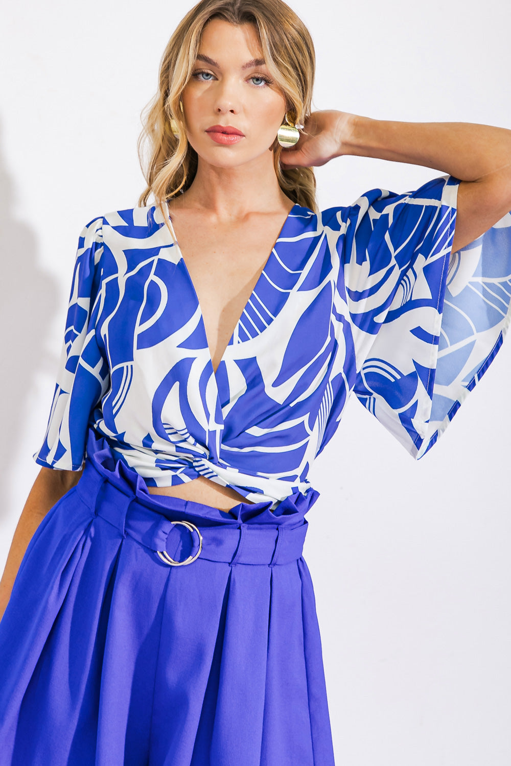 A printed woven top featuring shirt collar, V neckline, short sleeve, twisted front waist band and smocked back waist band. Matching pant IP8410