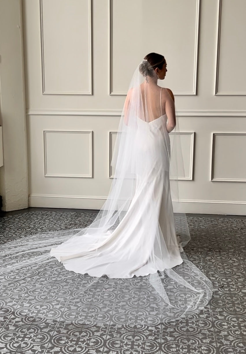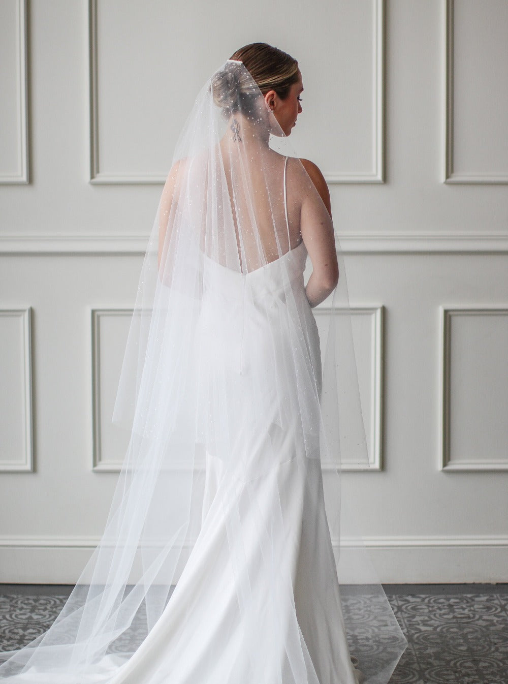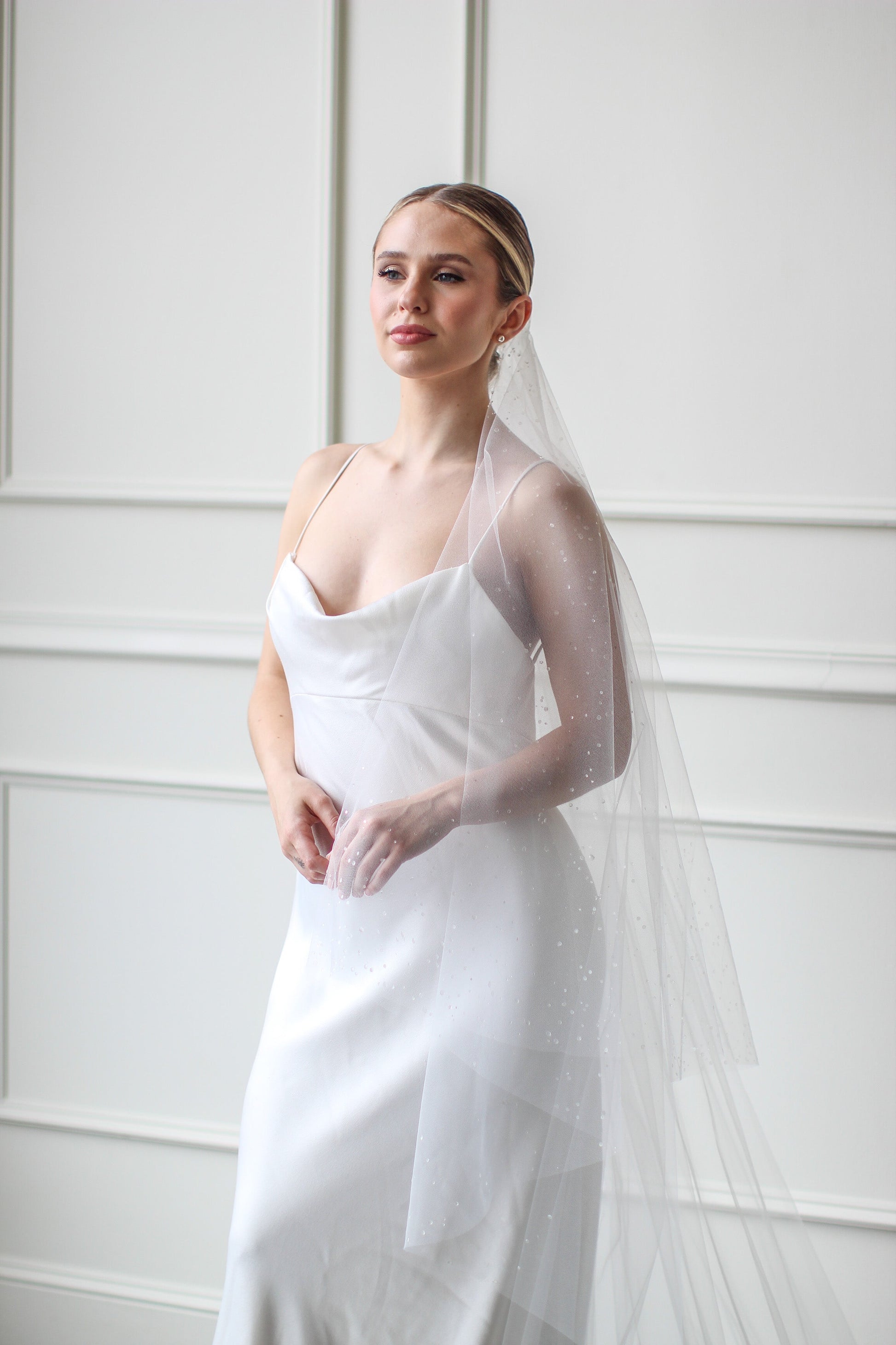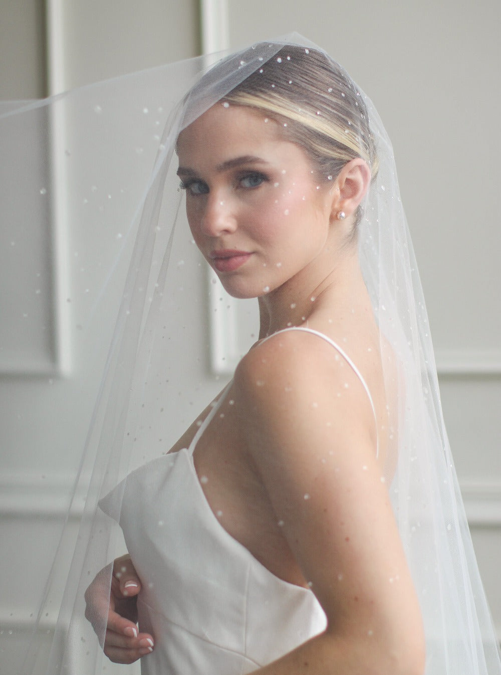 This veil is made in a drop veil style drapes over your head create a sleek minimal look with no volume near the comb. We strategically place the dew drops so that your face isn't covered (in dew drops) when the veil is worn with the blusher over your head.