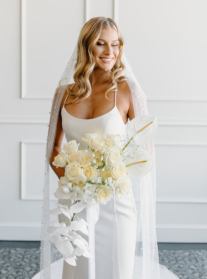 One of a kind scattered pearl veil on stunning soft bridal tulle. Each veil is custom made to your desired length and attached to a metal comb.