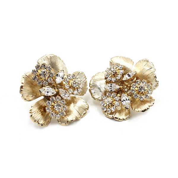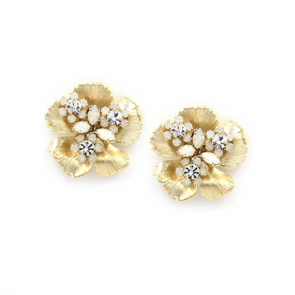 Golden petals bloom from a crystal cluster of sparkle. This stud will give a vintage or modern touch to any bridal look.