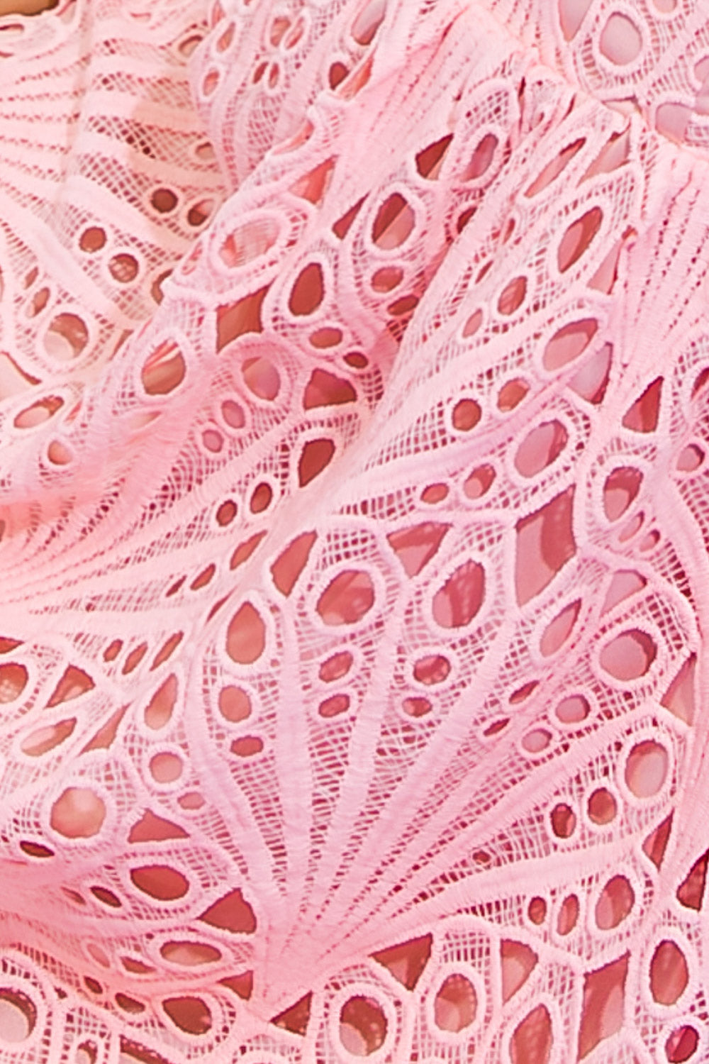 A woven lace mini dress featuring straight neckline, contrasting shoulder tie, scalloped hemline and back zipper closure