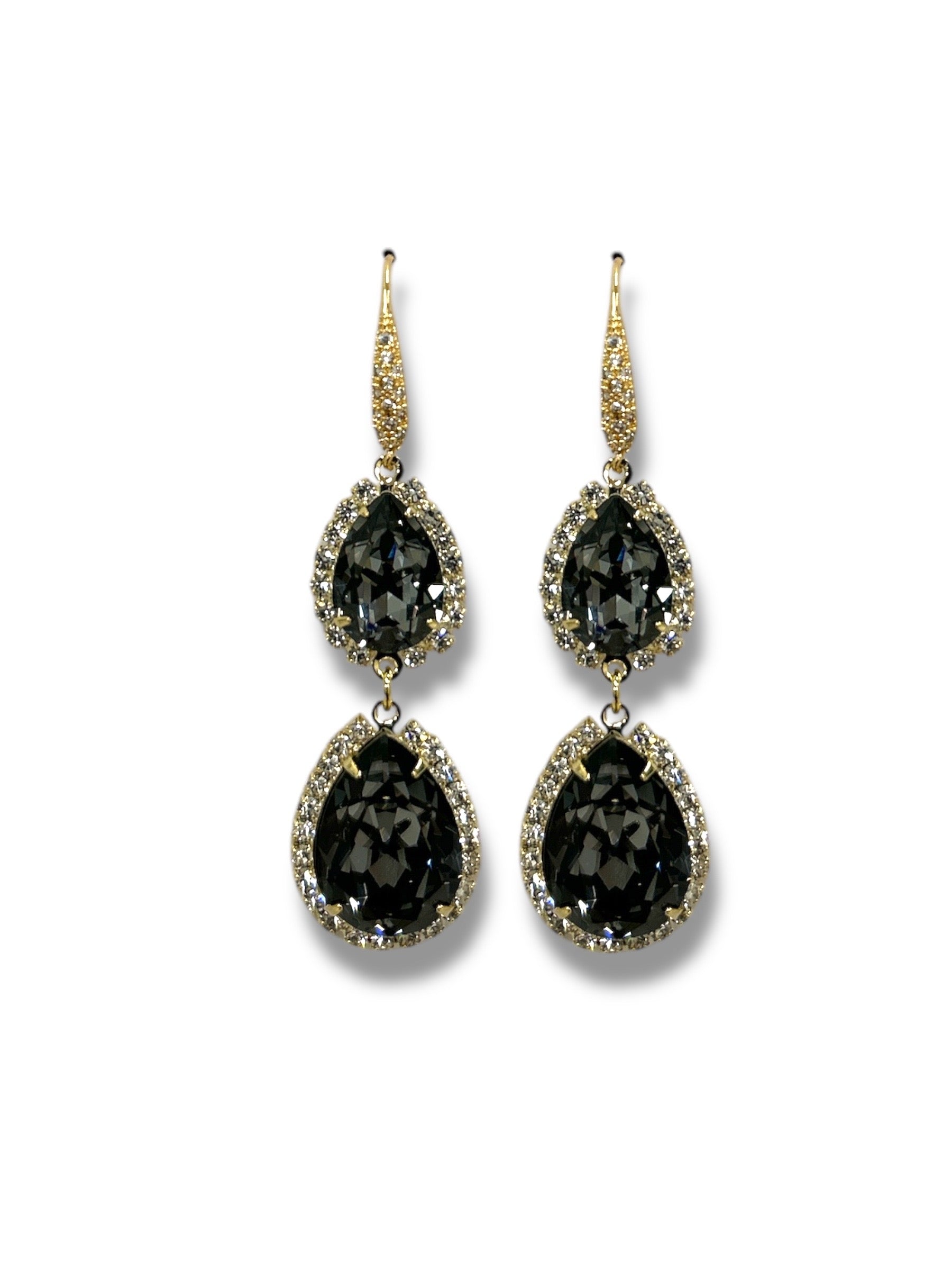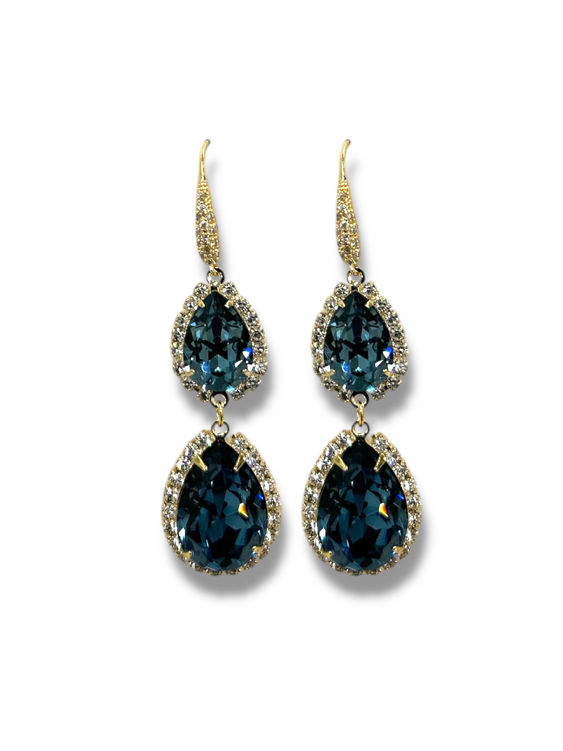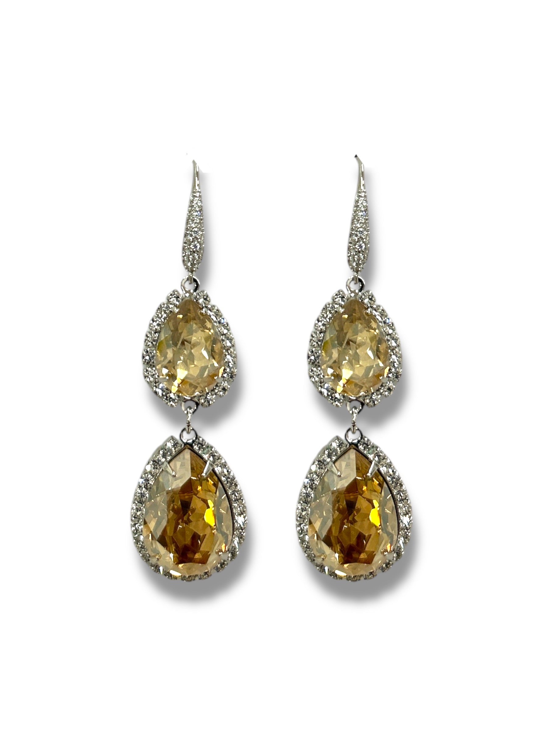 Two pear-shaped drops with crystal detailed french CZ nickel-free plated hook. Available in rhodium (silver) and gold. Show in crystal with silver.
