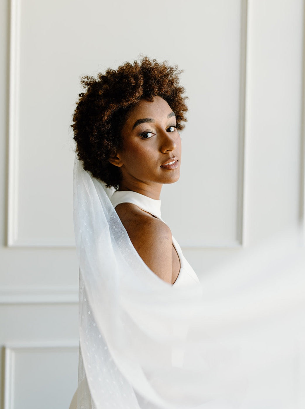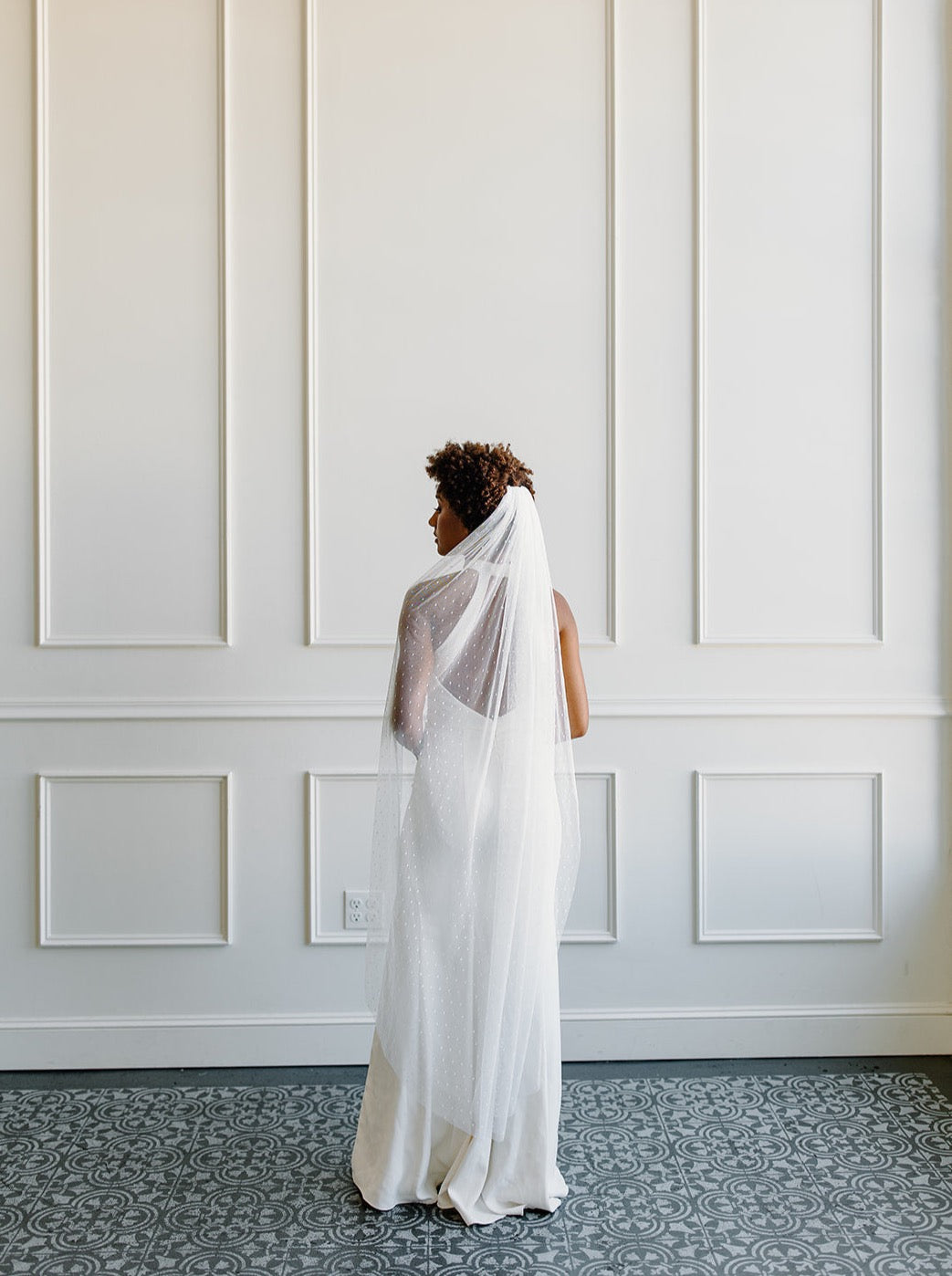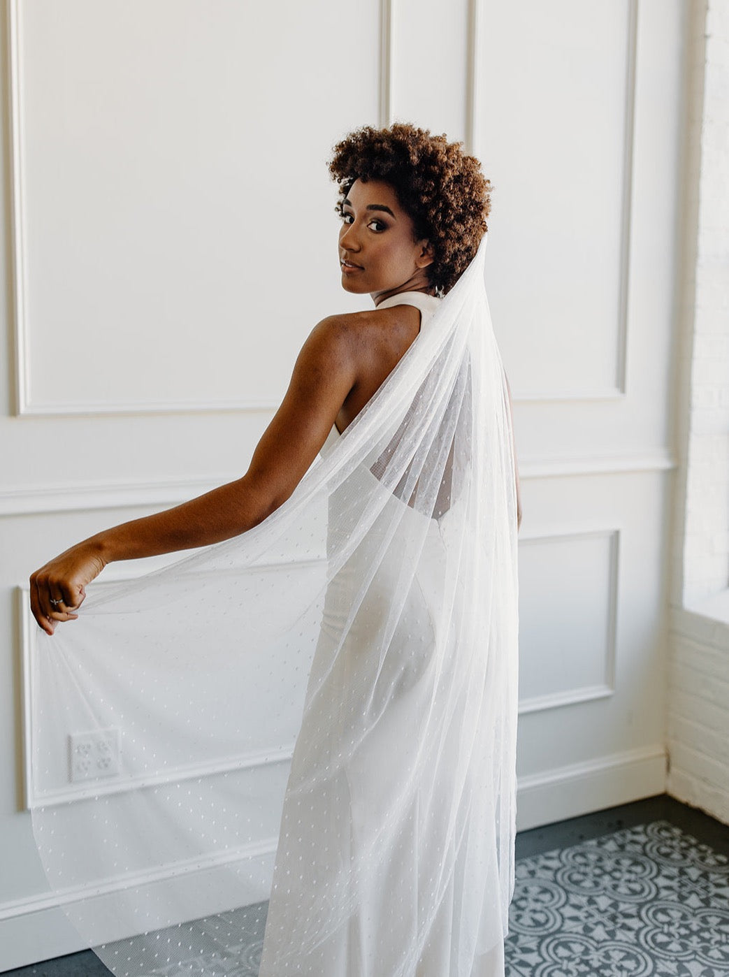 This veil has a maximum width of 58 inches. This will give the longer veils (chapel or cathedral length) more of an oval shaped train. This is a raw edge veil.