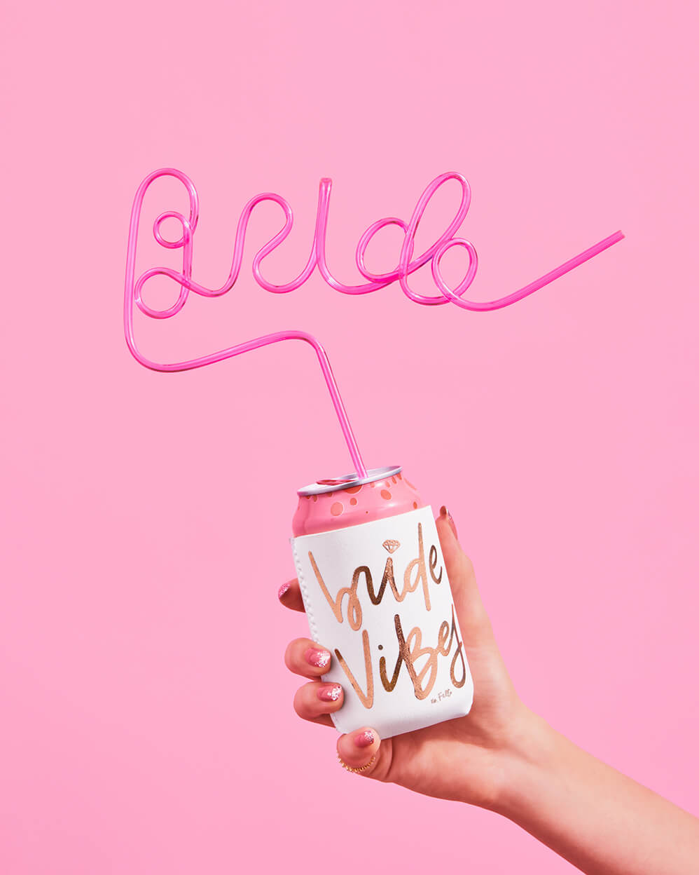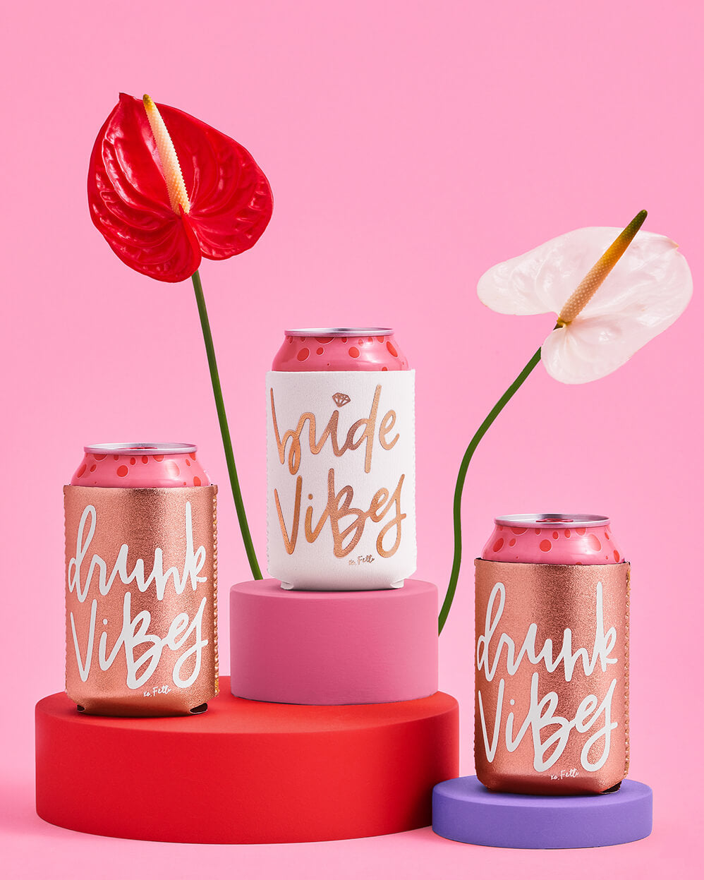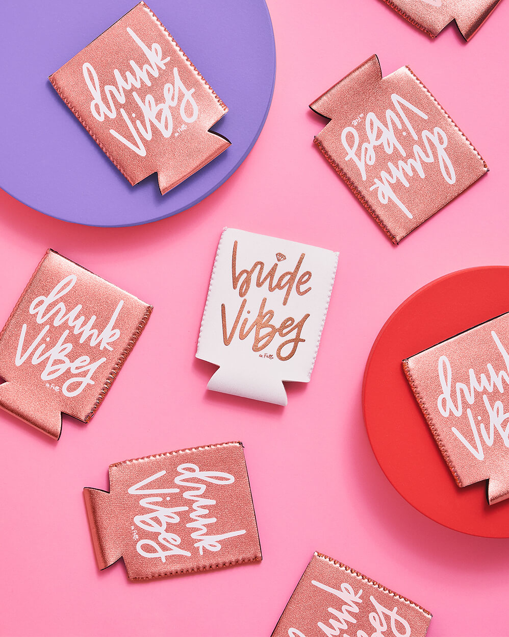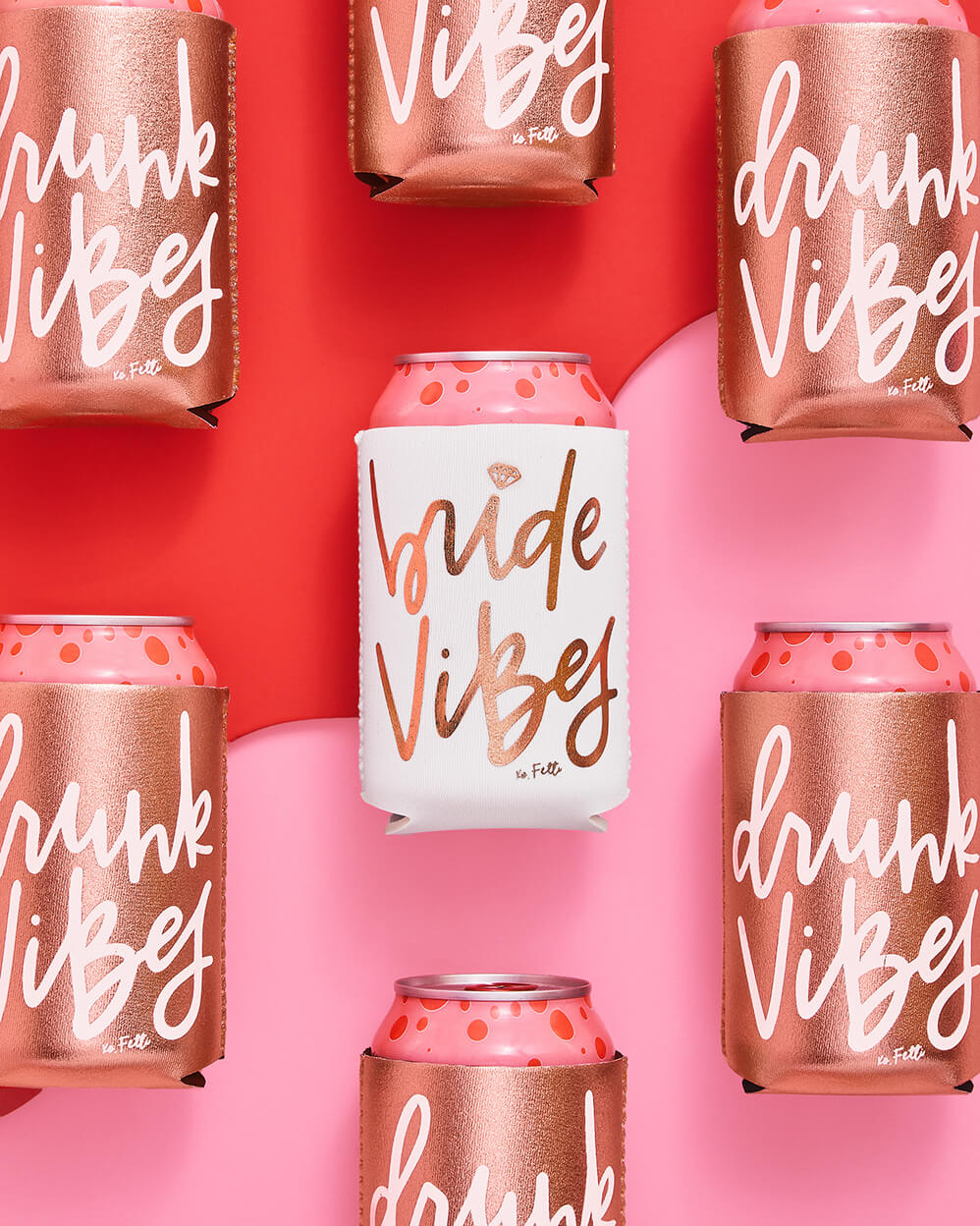 1 “Bride Vibes” white drink holder w/ rose gold text