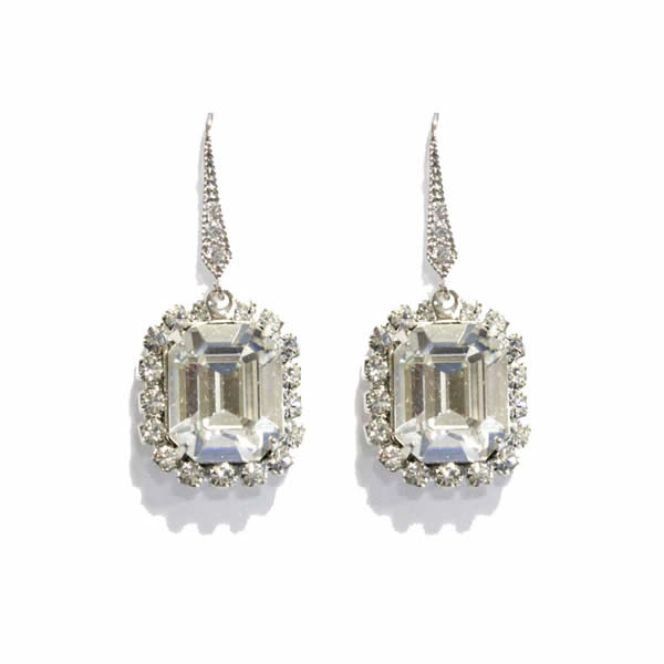 Emerald cut with just the right amount of sparkle. Accented with a clear rhinestone bezel and set on a cubic zirconia french hook.