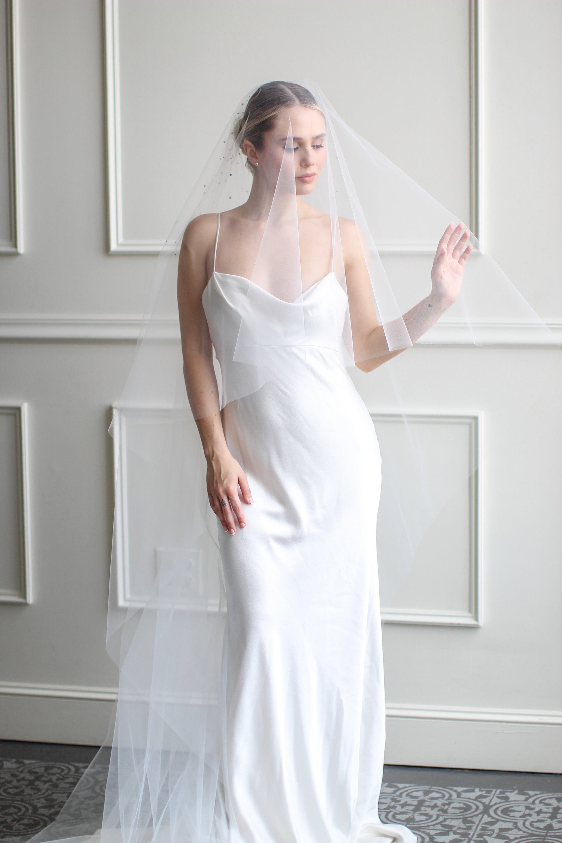 Double layer, raw edge tulle veil attached to a metal comb. Lightweight luxurious tulle drapes beautifully from the comb down to a more voluminous shape. This is a great option for brides wanting the traditional veil look. Second layer can be worn over the face or behind the head.